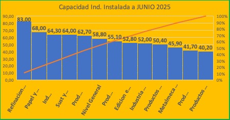 En la medición efectuada durante el mes de Agosto de 2025 los bloques sectoriales que presentan niveles de utilización de la capacidad instalada superiores al nivel general son refinación del petróleo (86,10%),Industria metalizas básicas 70,4%, Productos alimenticios y bebidas 66,8% ,papel y cartón 61,40$ y sustancias y productos químicos 60,10% Sectores de actividad y cap. industrial instalada Agosto 2025. Refinacion petroleo 86,10 Ind Metalicas básicas 70,40 Prod alimenticios y bebidas 66,80 Papel y cartón 61,40 Sust y productos quimicos 60,10 Nivel General 59,40 Prod minerales no metálicos 58,50 Industria automotriz 53,30 Edicion e impresión 50,90 Productos del Tabaco 46,90 Metalmecanica exp autom 44,40 Prod cauchos y plastico 42,10 Productos textiles 41,50
