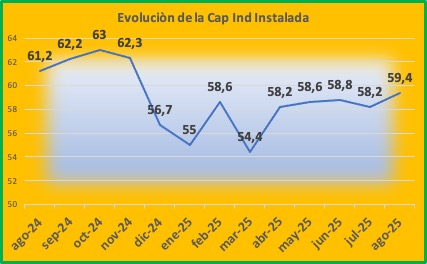 CONCLUSIÓN RESPECTO A LA CAPACIDAD INDUSTRIAL INSTALADA A AGOSTO DE 2025 Se observa que en la comparación interanual la capacidad industrial instalada muestra un retroceso respecto a su similar anterior, y aquí aparecen diferentes factores donde las importaciones marcan su fuerte incidencia al igual que la caída del consumo en general. Esta situación tiene su efecto directo dado que la baja de consumo afecta a la demanda general y consecuentemente la merma en la producción. El bajo poder del salario , la merma de la demanda, la influencia de productos importados, la falta de competividad de los precios de productos de exportación, los elevados costos de producción, llevan a que la industria no trabaje al máximo de su potencial. Se espera que el ultimo trimestre del año ponga en evidencia sobre la fragilidad de la economía en general y que su recuperacion llevara un tiempo prudencial superando el año 2026 y quizas el año 2027 con los primeros frutos hacia fines de este ultimo año .. Es mi visión
