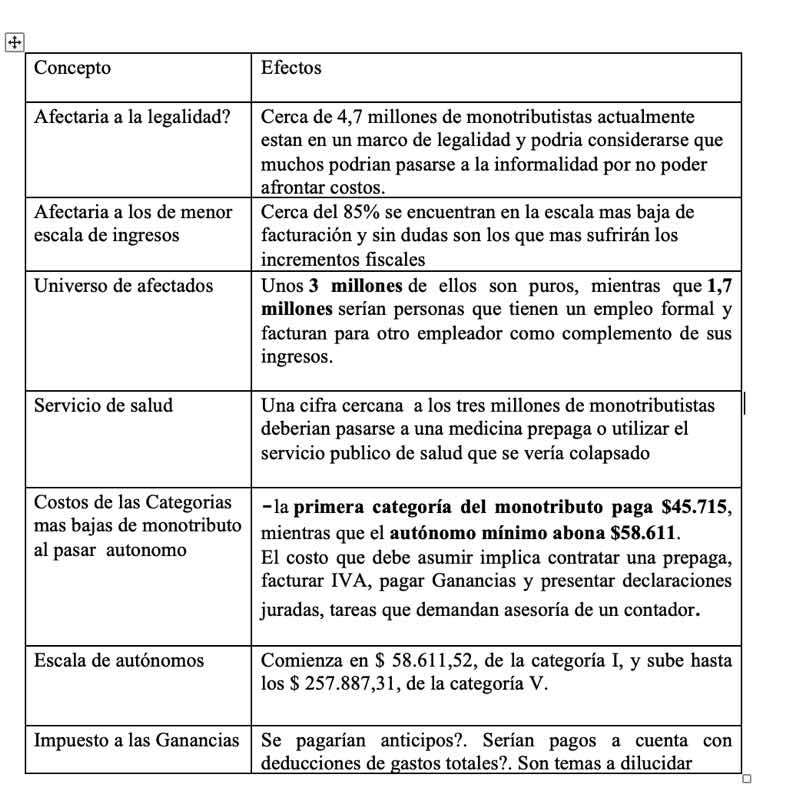 A pesar de la desmentida de esta eliminacion de parte de autoridades nacionales, no menos cierto es que es una exigencia del FMI y ante tal situación es relevante analizar cuales podrian ser sus efectos. En una primera reflexion se puede expresar que encareceria la actividad del pequeño monotributista dado que debería acudir a un servicio de salud prepago, cobrar y pagar el IVA, pagar el impuesto a las ganancias y el ingreso de autonomos